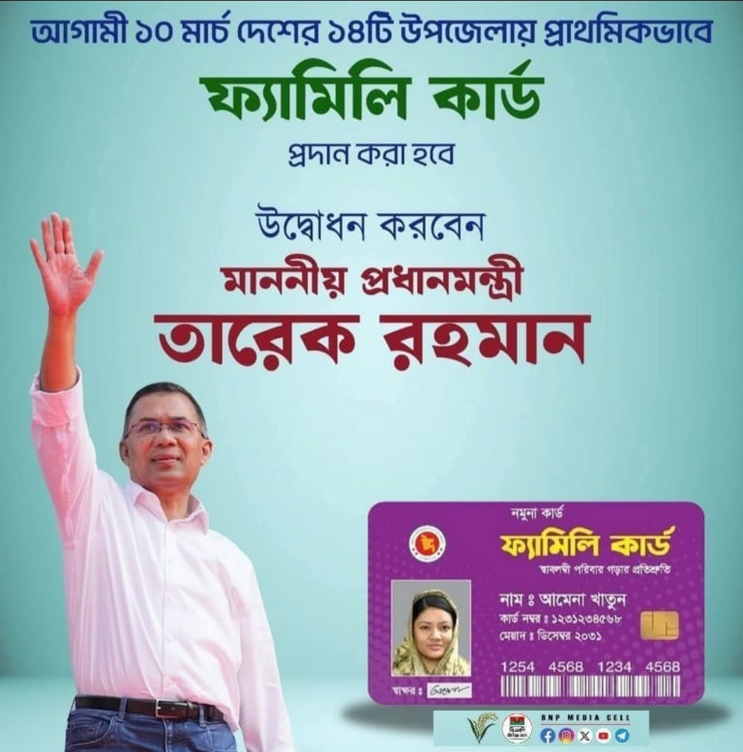 ১০ মার্চ ফ্যামিলি কার্ড কর্মসূচির উদ্বোধন করবেন প্রধানমন্ত্রী তারেক রহমান